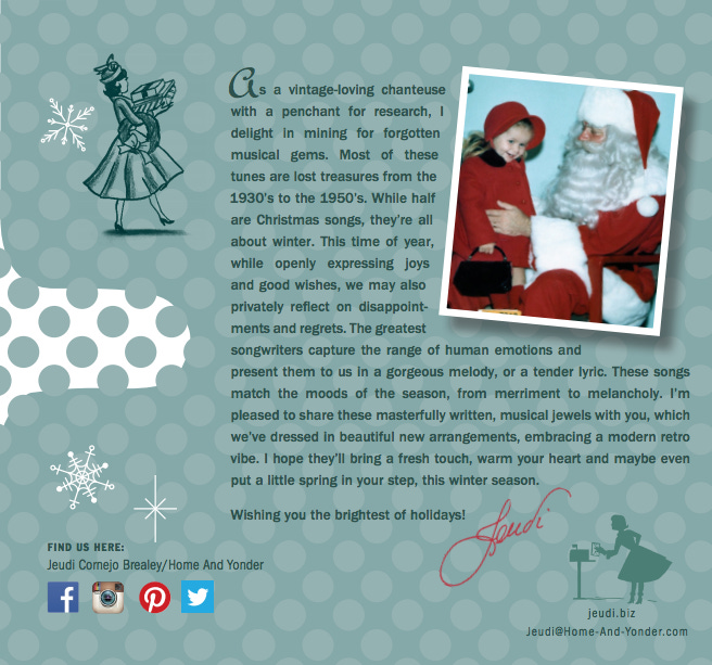 Here are photos of the physical album + liner notes that give the back story! I’m so proud of the music, but also of the careful curation of these rare and forgotten gems mostly from 1930s to 1950s, which capture all the moods of the season from merriment to melancholy. This is suitable for people of different faiths, as well. There are 7 tunes about Winter / 7 about Christmas. Scroll down for music video & shopping links. For a different artistic insight, follow my indie music journey here.