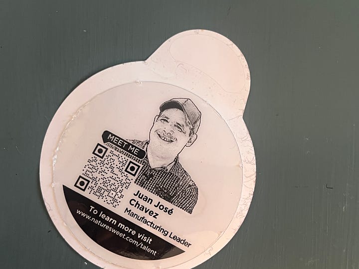 We buy these NatureSweet brand of tomatoes frequently, yet I only just noticed the “Peel here to lettuce us out” tab on the label. Of course, it piqued my curiosity, so I removed the tab and discovered this shout out to a team member named Juan José Chavez. Upon scanning the QR code, I was brought to his personal bio page, highlighting his story! Indeed the certified B-Corp has entire webpage dedicated to thanking their associates’ contributions. You can even write a special “Thank you” directly to individual workers, which brought tears to my eyes. What is apparent is that the workers are treated with dignity and that their labor is valued and that the company offers them not only safe working conditions, but also opportunities for growth and education. The page states: “As a business, we grow tomatoes, cucumbers, and peppers, but our higher calling is to unleash the power of people and to help them truly shine.”